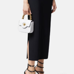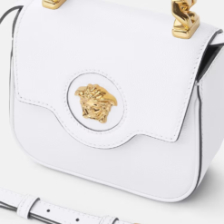 The La Medusa mini bag has been crafted in Italy from grained leather. The central Medusa is instantly recognizable, and the fixed-chain top handle adds an alternate carry option along with the detachable and adjustable shoulder strap.