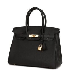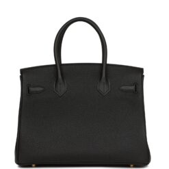 This Birkin is in Black togo leather with gold hardware and has tonal stitching,front flap, two straps with center toggle closure, clochette with lock and two keys, and double rolled handles.