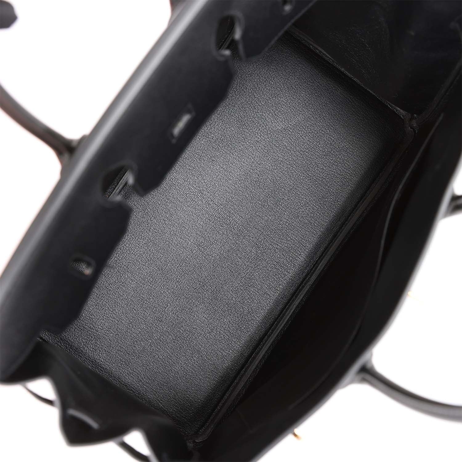 The interior is lined with black chevre and has one zip pocket with an Hermes engraved zipper pull and an open pocket on the opposite side.