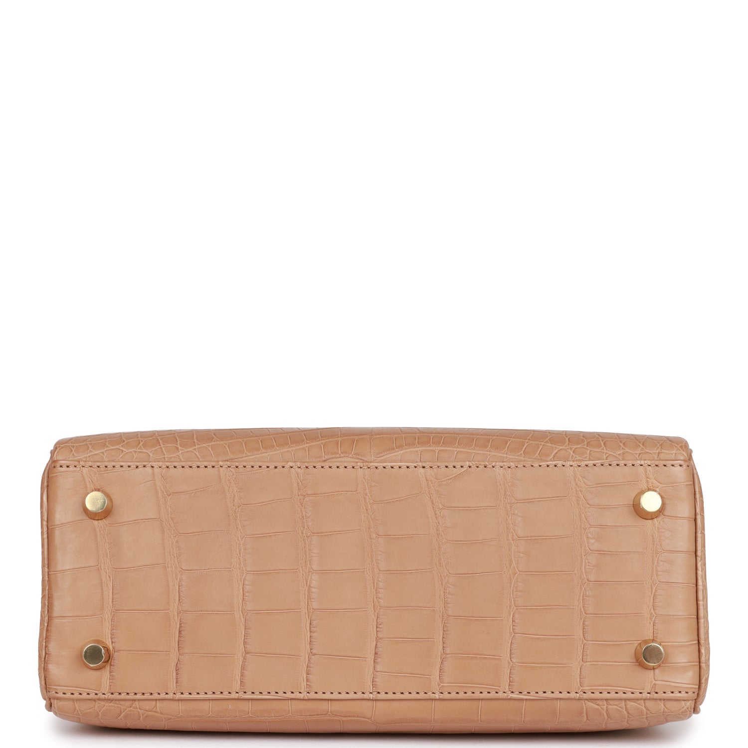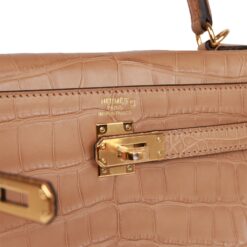 This Retourne Kelly is in Chai matte Mississippiensis alligator with gold hardware and has tonal stitching, front flap, two straps with center toggle closure, clochette with lock and two keys, single rolled handle and removable strap.