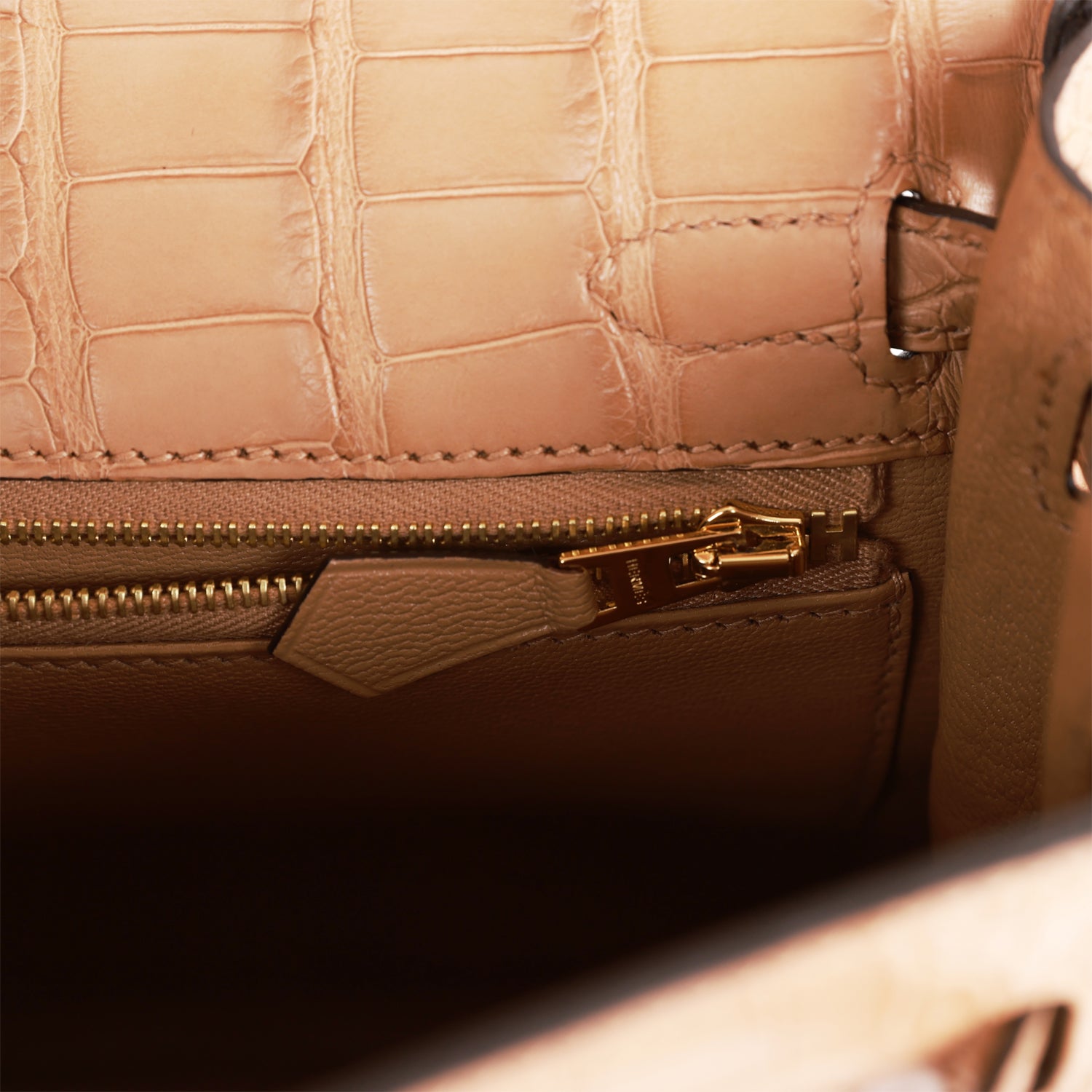 The interior is lined with Chai chevre and has a zip pocket with an Hermes engraved zipper pull and two open pockets on the opposite side.