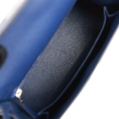 The interior is lined with Bleu Saphir chevre leather and has one zip pocket with an Hermes engraved pull and one open pocket on the opposite side.