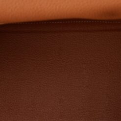 The interior is lined in gold chevre and has one zip pocket with Hermes engraved pull and two open pockets on the opposite side.