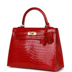 Hermès Kelly Sellier 25 Braise Shiny Porosus Crocodile Gold Hardware