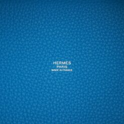 This Casaque Picotin is of Rouge de Coeur, Rose Extreme, and Bleu Zanzibar Clemence leather with palladium hardware and has tonal stitching with two top handles