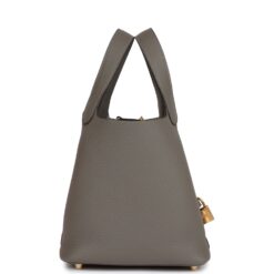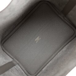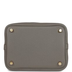 This Picotin Lock is in Gris Meyer clemence leather with gold hardware and has tonal stitching with two top handles.